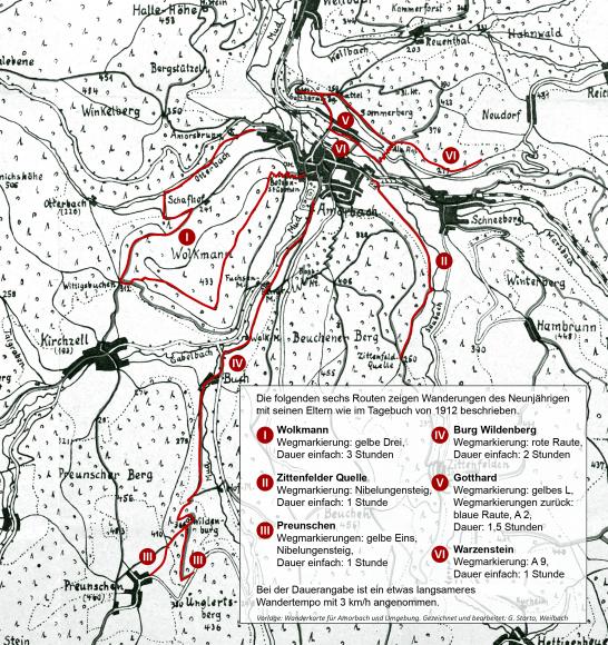 Die sechs Touren Wolkmann, Zittenfeld, Preunschen,Amorbach, Gotthard und Warzenstein zeigen Wanderungen des neunjährigen Theodor W. Adorno, die er in seinem Tagebuch von 1912 beschrieben hatte. Sie können die einzelnen Punkte auf der Karte anklicken und kommen dann auf die jeweilige Seite mit Bildern von den Routen, einem kurzen Video und der Beschreibung. Die Preunschen Tour und die Wildenburg Tour wird ergänzt durch zwei näher beschriebene Stationen entlang des Weges.