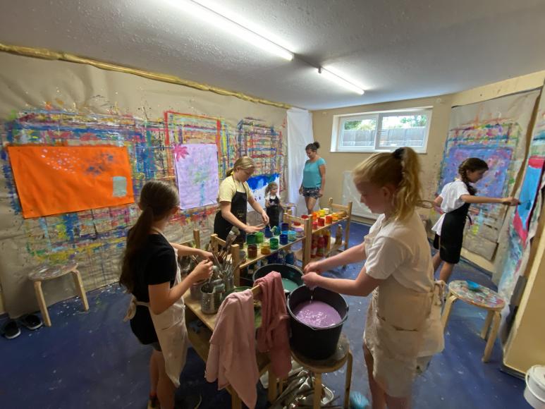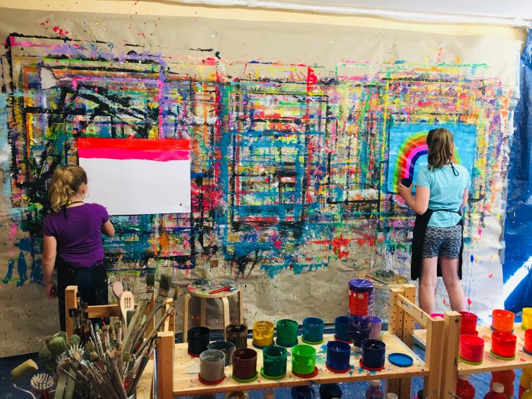 Der Raum ist so gestaltet, dass gespritzt und gekleckert werden darf. Über 20 leuchtenden Gouache Farben, Pinseln, Schwämmen uvm. stehen hierbei zur Verfügung. Es darf auch gerne mit den Händen gemalt werden.