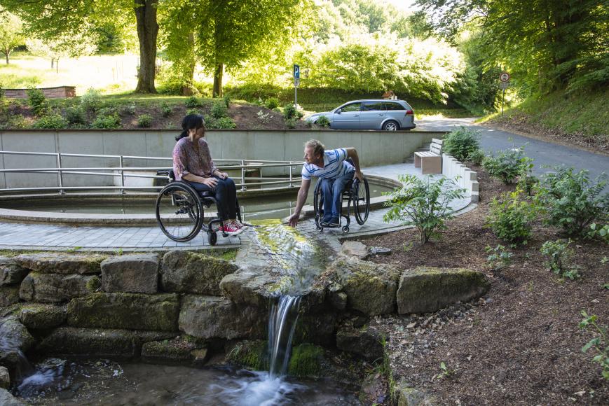 Jede Gemeinde im Netzwerk „Barrierefreie Erlebniswege im Spessart“ hat sich ein Motto gesetzt. In Mespelbrunn ist es „Natur und Wasser“. Die ehemalige Wassertretanlage „Am Gänsbrunnen“ wurde in einen barrierefreien Wassererlebnisbereich umgestaltet. Aktionsfelder mit viel Wasser erwarten den Besucher. Das Gelände verfügt über behindertengerechte Parkplätze und Wege, einen parallel dazu angelegten bespielbaren Bachlauf und eine barrierefreie Wassertretanlage. Alle können es hier erleben – das prickelnd lebendige Gefühl wenn es wieder warm wird.