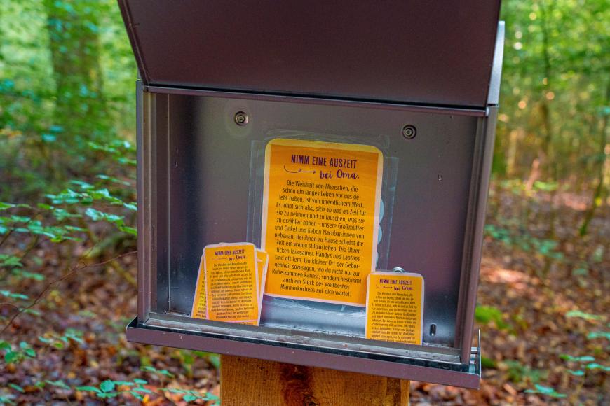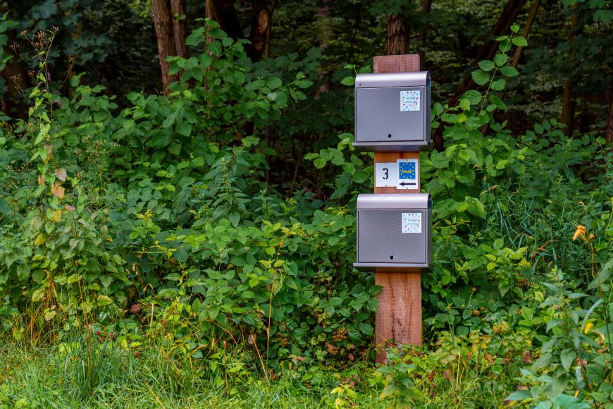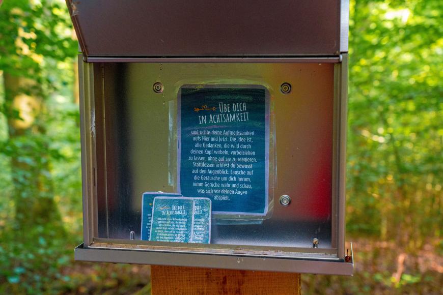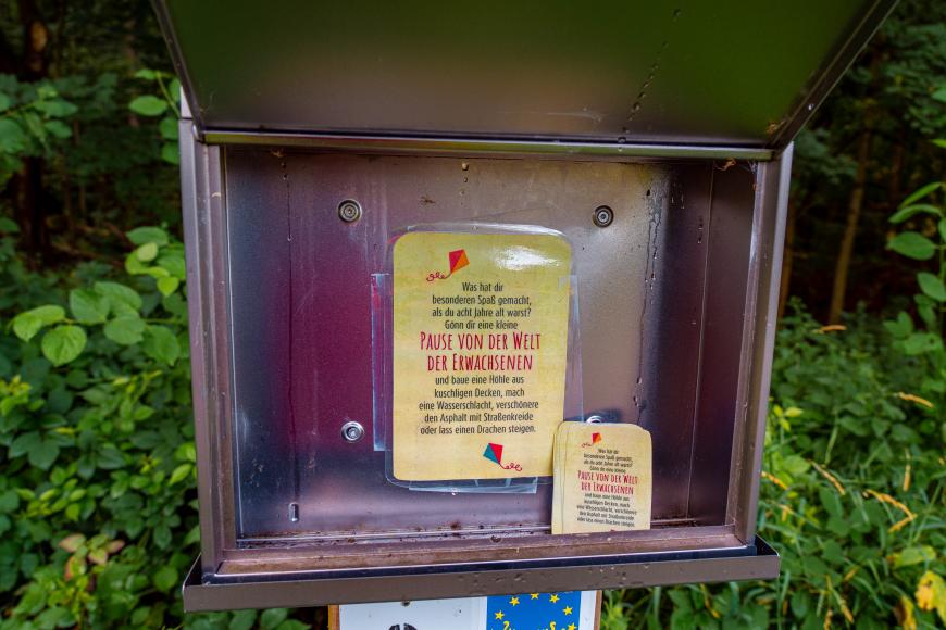 An jeder Station stehen zwei Briefkästen bereit: einen, der höher hängt, für die Erwachsenen und einen, der auf Augenhöhe der Kinder hängt. Ihr könnt die Klappen öffnen und euch von wechselnden Themen und Impulsen inspirieren lassen. Neben meditativen Gedanken finden sich bei den Kindern unter anderem auch kleine Aufgaben, Texte, Bilder oder Rätsel. Zum Beispiel werden sie an einer Station zu einem Vertrauensspiel eingeladen, bei dem die eine den anderen blind führen soll. Etwa alle drei bis vier Monate wechseln die Inhalte und Themen der Kästen. Es gibt also immer etwas Neues zu entdecken!