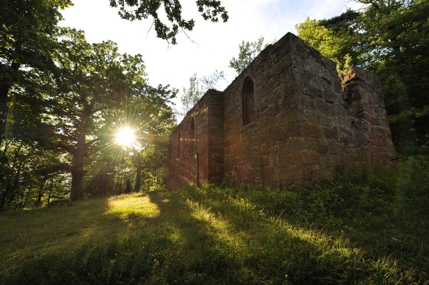 Die Bauruine aus dem 17. Jahrhundert zieht jeden Besucher, der auf den Eichenbuckel oberhalb Bürgstadts kommt, in ihren Bann. Benannt ist sie nach ihrem Bauherrn, dem Bürgstadter Centgrafen Leonhard Gackstatt. Das Bauprojekt wurde bereits im Jahr nach Grundsteinlegung eingestellt, das Gotteshaus somit nie seiner Bestimmung zugeführt. Warum, ist unklar. An einer schlechten Aussicht dürfte es jedenfalls nicht gelegen haben, denn der Blick ins Maintal ist atemberaubend. Darum führt auch fast jeder Wanderweg im Bürgstadter Wald an diesem verwunschenen Ort vorbei.