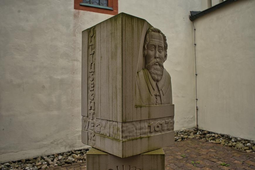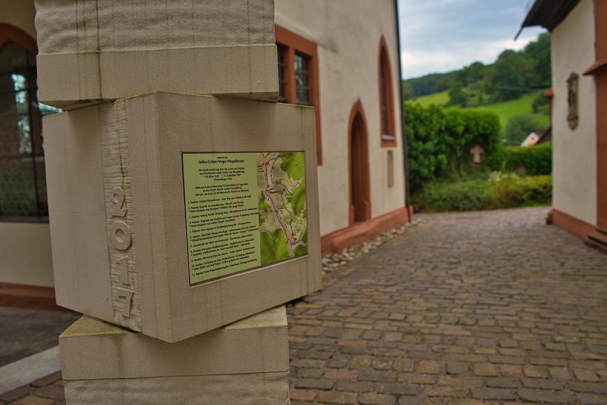 Im Innenhof der Wallfahrtskirche, einem Ensemble aus 3 Sakralgebäuden, finden Sie eine Steinstele von Steff Bauer. Dort wird dem 400. Todestags Julius Echters gedacht. Die Gnadenkapelle und Wallfahrtskirche sind einen Besuch wert. Dort finden Sie unter anderem das große „Echterepitaph“, eines Kunstwerks, welches die Familie Julius Echters zeigt.Der Rückweg führt entlang des Baches Elsava zurück Richtung Mespelbrunn. Am Feuerwehrhaus befinden sich öffentliche Toiletten. Nach einem Kinderspielplatz erhalten Sie Informationen über die Förderung der Wallfahrtsorte und die Verehrung von Heiligen durch Julius Echter.