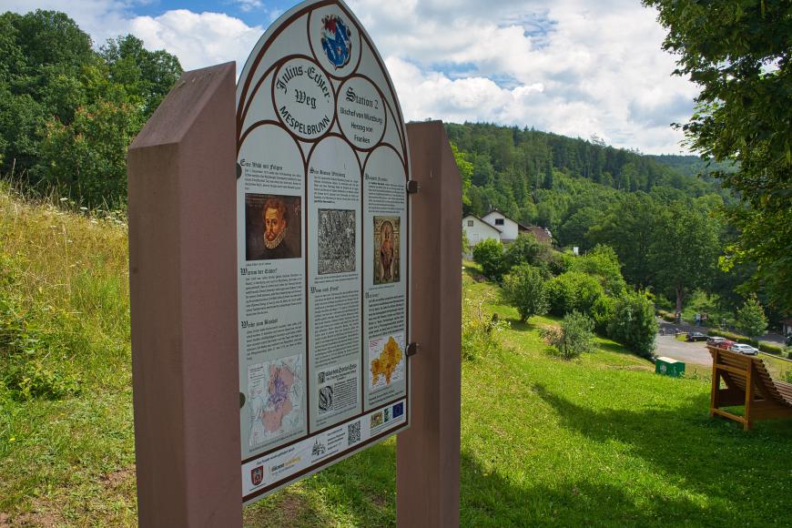 Der Würzburger Bischof Julius Echter, der Mitte des 16. Jahrhunderts in Mespelbrunn geboren wurde, gehört zweifelsohne zur Geschichte Mespelbrunns und zum gesamten Spessart. Ausgehend vom Schloss Mespelbrunn führt der ca. 9 Kilometer lange Rundweg zum Leben und Wirken von Julius Echter über Hessenthal und entlang der Elsava zurück nach Mespelbrunn. An 11 unterschiedlichen Stationen finden sich Informationstafeln und Kunstwerke von verschiedenen Künstlern.