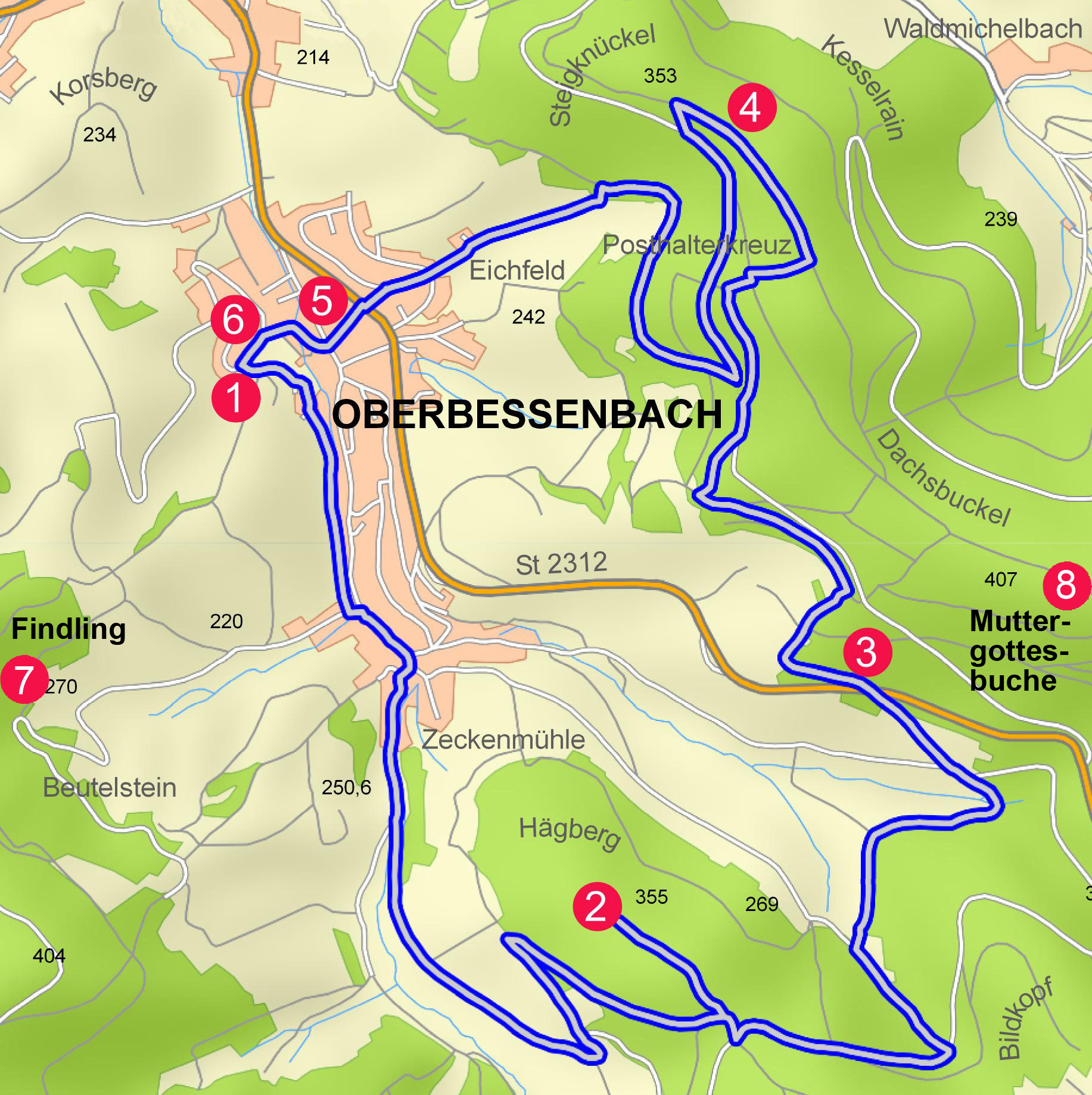 Der 12 Kilometer lange Kulturrundweg führt von Oberbessenbach bergauf zum Frau-Holle-Stein auf dem Hägberg (Stichweg) und von dort weiter zum ehemaligen Keiner-Steinbruch. Bergauf steigend wird das Posthalterskreuz erreicht, von dem es über das Gänskreuz zurück in den Ort mit dem Hausbrunnen und zum Abschluss an die Ottilienkirche geht.