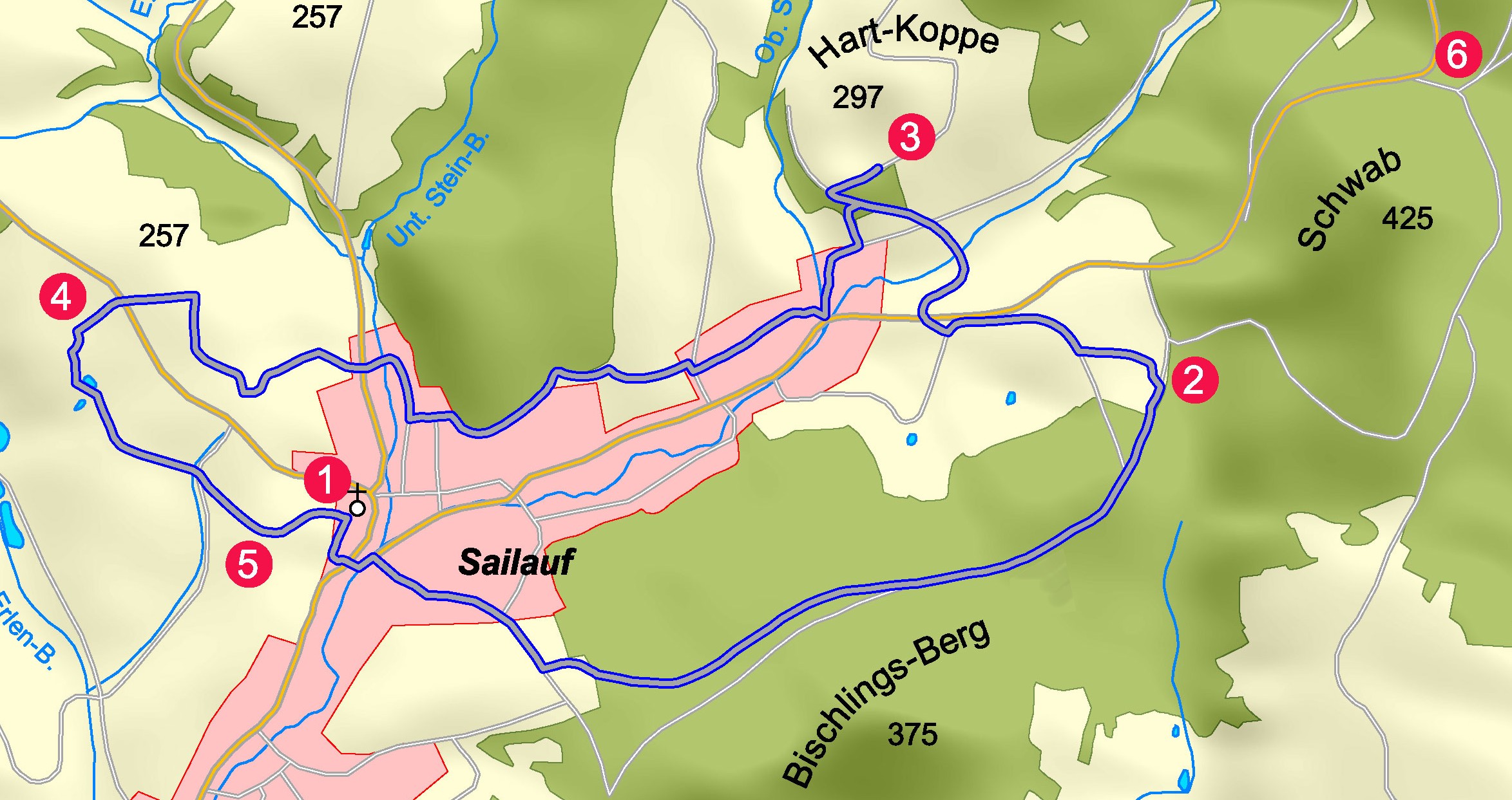 Der Sailaufer Kulturweg beginnt an der St.-Vitus-Kirche mit dem sogenannten „Bleckmaul“. Über den Sailauf-Bach verlassen wir in Richtung Osten die Ortschaft und wandern auf dem Römerweg durch den schattigen Wald. Beidseitig des Weges sieht man trichterförmige Vertiefungen (sogenannte Pingen), die an die Zeit des Erzschürfens erinnern. Die nächste Station befindet sich am Steinbruch Hartkoppe, wo vor wenigen Jahren das seltene Mineral „Sailaufit“ entdeckt wurde. Der Schwerpunkt des Abbaus stellt aber der Rhyolith dar, der Anwendung im Straßenbau findet. Weiter geht es zum Sämenhof . Ein ehemaliger Aussiedlerhof, der heute als Gastwirtschaft mit Biergarten ausgebaut zum Verweilen einlädt. Von hier aus lohnt ein Abstecher zur Rottenberger Kapelle, bevor man über den Streuobstlehrpfad wieder die St.-Vitus-Kirche erreicht.