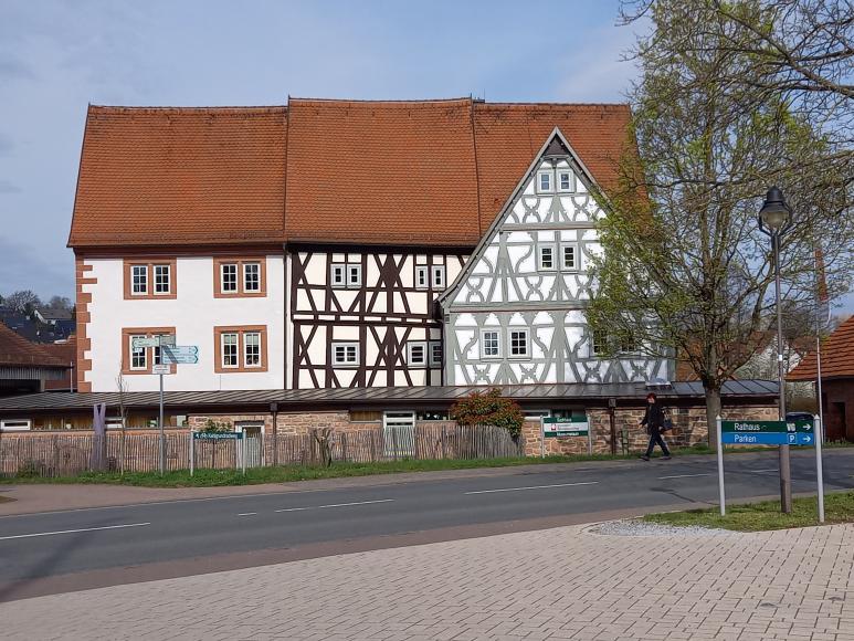 Fast 100 Jahre später, im Jahr 1572, entstand ein Fachwerkanbau mit massivem Erdgeschoss und einem zweigeschossigen Seitenflügel (rechts). Das Renaissance-Fachwerk zeigt "Mannfigur"-Verstrebungen und "Feuerböcke" in den Brüstungsfeldern - eine für Ort und Zeit ungewöhnlich reiche Ausbildung von Zierformen.
