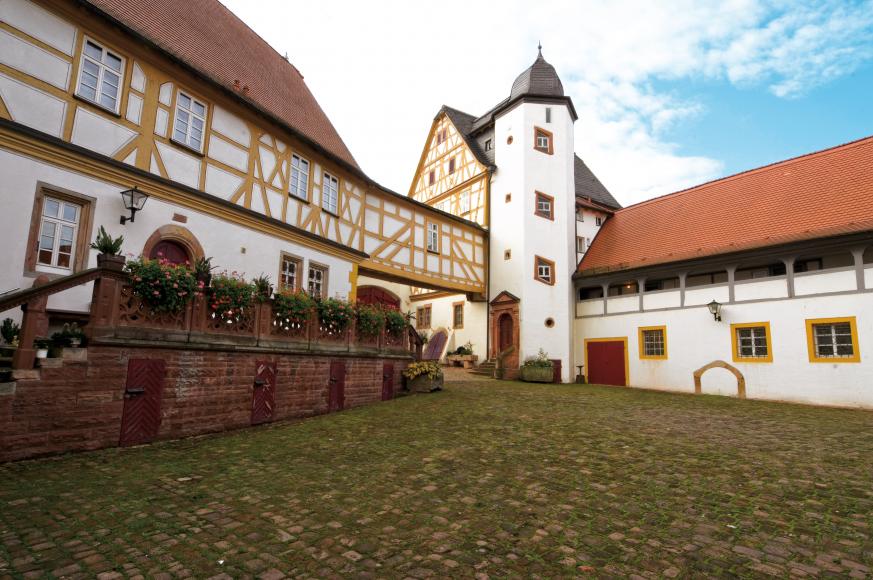 Das vom sechseckigen Treppenturm erschlossene Hohe Haus wurde 1571 erbaut. Seinen stuckverzierten Wohnräumen dienten den Stiftspröpsten, also den Mainzer Erzbischöfen, als Residenz. Im 1579 errichteten und von einer Außentreppe mit Maßwerkbrüstung geprägten Mittelbau wohnten die Faktoren. Im Zuge der Sanierung des Gesamtkomplexes zwischen 1993 und 2001 wurde die Farbgestaltung wieder der originalen Fassung um 1580 angepasst: Die Balken des Fachwerks sowie ein breiter Streifen an beiden Seiten in kräftigem Ockergelb, die Gefache in hellem Beige. Ein schwarzer Begleitstrich fasst das Ockergelb wirkungsvoll ein. Die Fenstergewände trugen ursprünglich aufwändige Malereien.