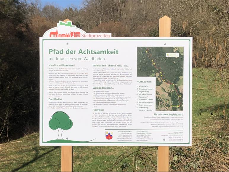 Entlang der Gemarkungsgrenze von Stadtprozelten und Dorfprozelten wurde ein ganz besonderer Erlebnisweg geschaffen, der nicht nur in das Waldbaden einführt, sondern auch für regionale Besucher wie Touristen interessant und attraktiv ist und gleichzeitig das Urtümliche der Landschaft erhält. Der „Pfad der Achtsamkeit“ führt die Besucher über acht Stationen („Acht-Samen“) durch den Stadtprozelt‘ner Wald und erklärt an den Stationen Übungen des Waldbadens und Qi Gongs zum Mitmachen.