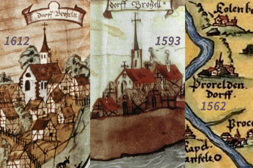 - Spessartkarte des Paul Pfinzing 1562 (publiziert 1594): Bis auf wenige Ausnahmen sind die Dörfer, Städte und anderen Siedlungen in ihr durch unspezifische, signaturartige 'Icons' dargestellt, so auch im Fall Dorfprozeltens. Informationen zu Details der Siedlungen oder gar einzelnen Gebäude lassen sich hiervon in der Regel nicht ableiten.