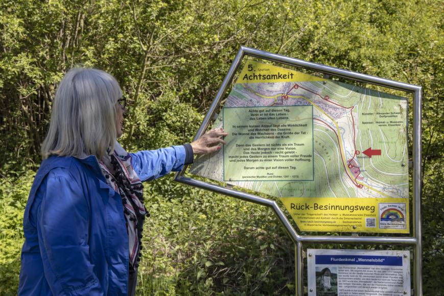 Der Rück-Besinnungsweg stellt die sieben in unserer heutigen Zeit wichtige Werte durch passende Texte in den Mittelpunkt der Betrachtung dar. An jeder der sieben Stationen lädt ein Kunstwerk zum Innehalten und Nachdenken und eine Ruhebank zum Verweilen ein. Der ca. 6 Kilometer lange Weg wurde im Oktober 2015 eröffnet.