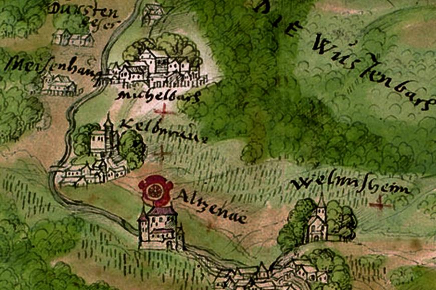 Die älteste Darstellung Michelbachs auf der sogenannten 'Jordan'schen Karte' von 1592 zeigt ein großes mehrstöckiges Gebäude im Zentrum des Dorfes. Hierbei könnte es sich um einen spätmittelalterlichen Wohnturm in der Art eines 'Weiherhauses' handeln. Ein örtliches Niederadelsgeschlecht, das als Erbauer und Besitzer infrage kommt, tritt erstmals 1234 in Gestalt eines Wigand von Michelbach urkundlich in Erscheinung. Seine Witwe verstarb 1245 als Nonne im Kloster Himmelthal bei Elsenfeld-Rück. Die Herren von Michelbach sind bis 1435 nachweisbar und standen in Lehensabhängigkeit zu den Herren von Ronneburg. Im 16. Jahrhundert besaß die Abtei Seligenstadt in ihrem Erbbestand ein großes Gut mit ausgedehnten Ländereien in Michelbach - womöglich ebendiesen Adelssitz mit dem zugehörigen Wirtschaftshof.