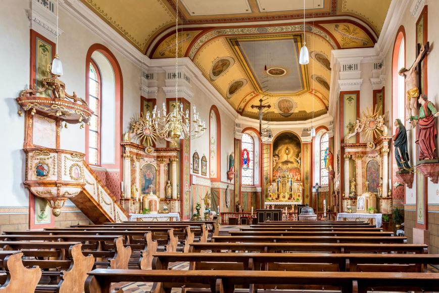 Der heutige Kirchenbau stammt vornehmlich aus dem Jahre 1789 und wurde mehrfach restauriert. An den mittelalterlichen Turm schließt sich das spätbarocke Kirchenschiff an, das durch vier Fensterachsen gegliedert ist. Der eingezogene Chor erstreckt sich über eine weitere Achse nach Osten und ist dreiseitig geschlossen. Die bodentiefen Fensternischen werden von toskanischen Pilastern flankiert. Die bleiverglasten Rundbogenfenster werden um 1860/70 datiert und sind mit der Signatur von H. Beiler, Heidelberg, versehen. Der Kirchenraum wird von Wandmalereien des 19. Jahrhunderts geziert, die zu Anfang des 20. Jahrhunderts weiß übertüncht und erst 1987–89 farbenprächtig rekonstruiert wurden. Im Stil des Historismus mit üppigen floralen Motiven zeigt das Bildprogramm im Chor Medaillons mit Darstellungen der vier Evangelisten, des Erzengels Michael sowie des Agnus Dei (Lamm Gottes) und oberhalb des Altars weitere bildliche Darstellungen.