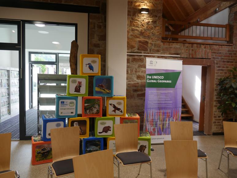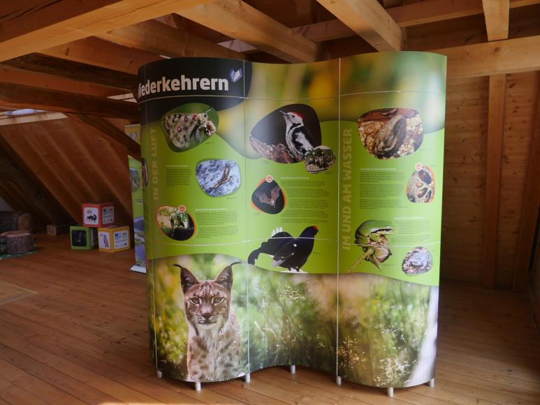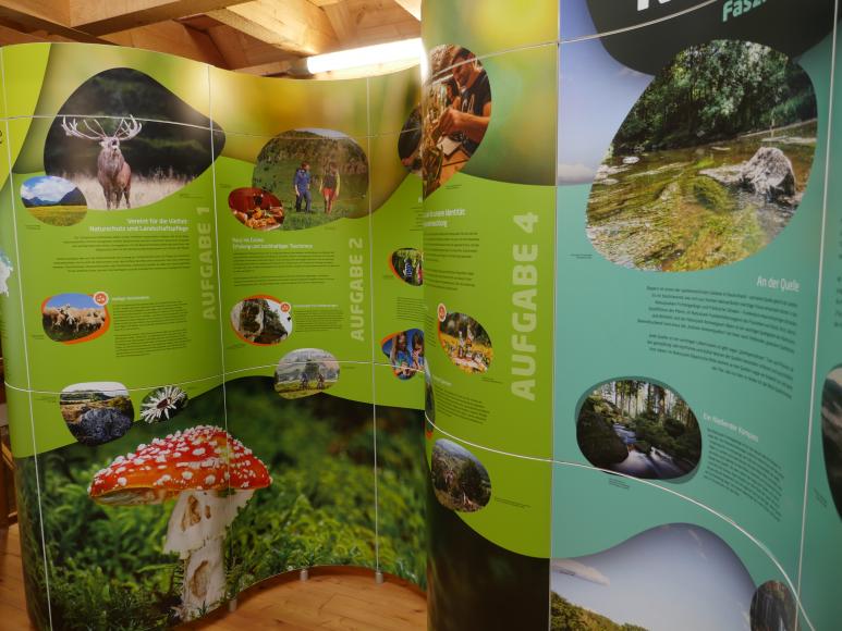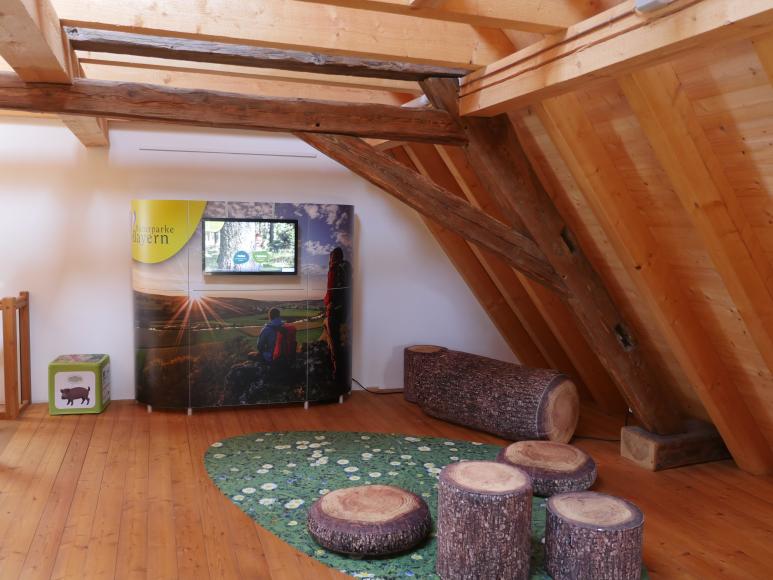 Außerdem befindet sich in der liebevoll restaurierten Scheune neben dem Haupthaus eine attraktive und informative Dauerausstellung zu den Naturparken in Bayern. Sie zeigt mit eindrucksvollen Bildern und Texten die Besonderheiten der 19 bayerischen Naturparke auf: ihre Pflanzen und Tiere, ihre Gewässer, ihre Geologie und auch die menschlichen Einflüsse, die diese Landschaften prägen. Der Geo-Naturpark Bergstraße-Odenwald mit seinem bayerischen Gebietsanteil ist mit seiner erdgeschichtlichen, naturräumlichen und kulturellen Vielfalt ebenfalls entsprechend präsentiert. Neben der reich bebilderten Ausstellung lädt eine Bildschirmpräsentation dazu ein, die Naturparke Bayerns näher kennen zu lernen.